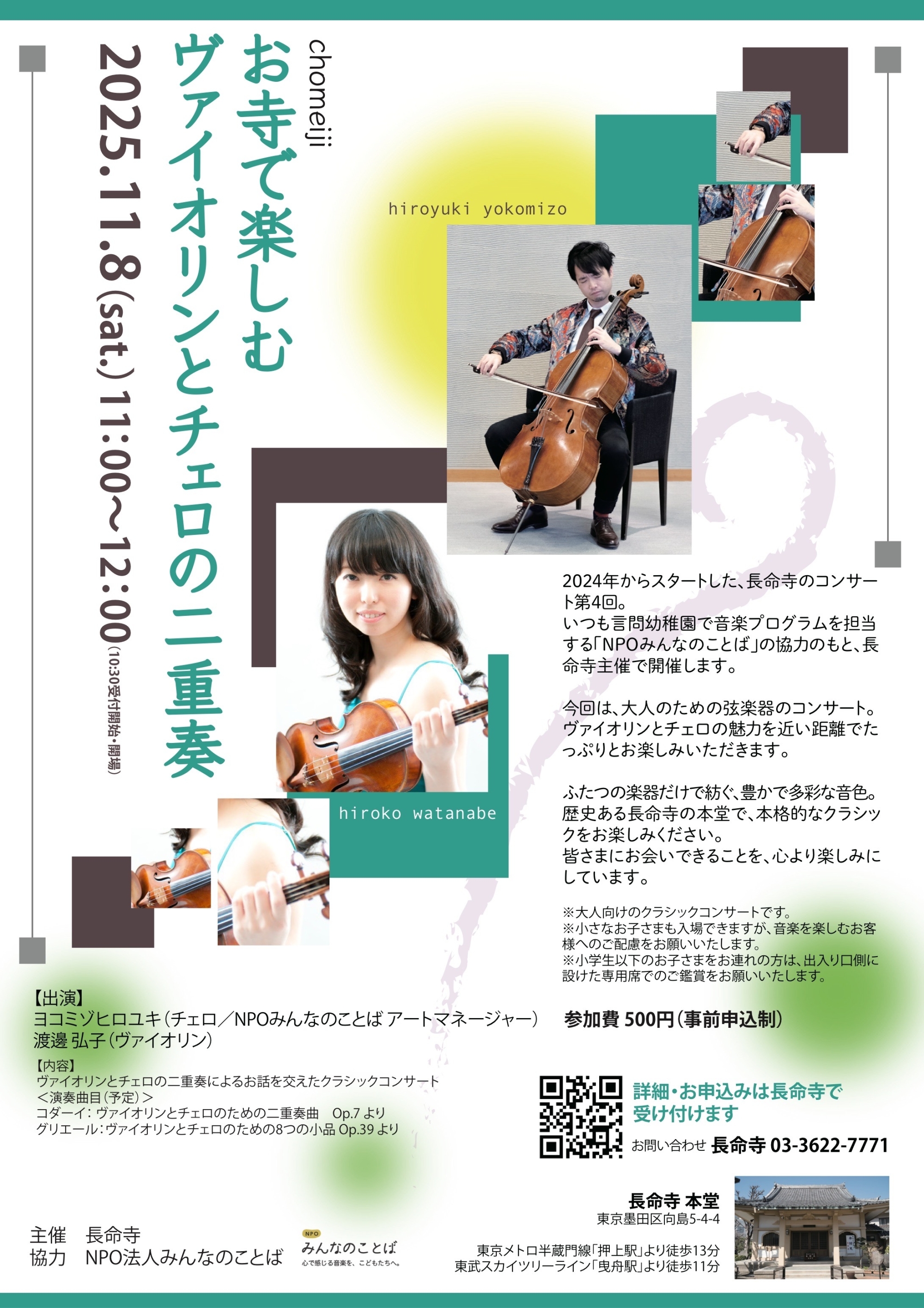 お寺で楽しむヴァイオリンとチェロの二重奏