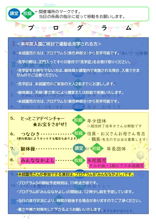 ・来年度の入園を検討されている方は、プログラム5「とっとこアドベンチャー お宝をさがせ!」(黄色枠部分) から見学可能です。